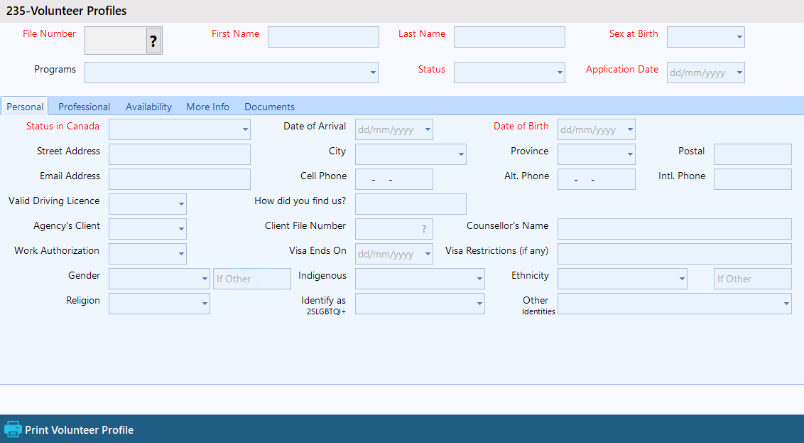 Step 4: Navigate to different tabs of the form to enter more information about the volunteer. These tabs include: